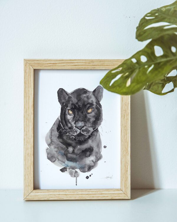Retrato artístico de una pantera con mirada profunda con salpicaduras decorativas.
